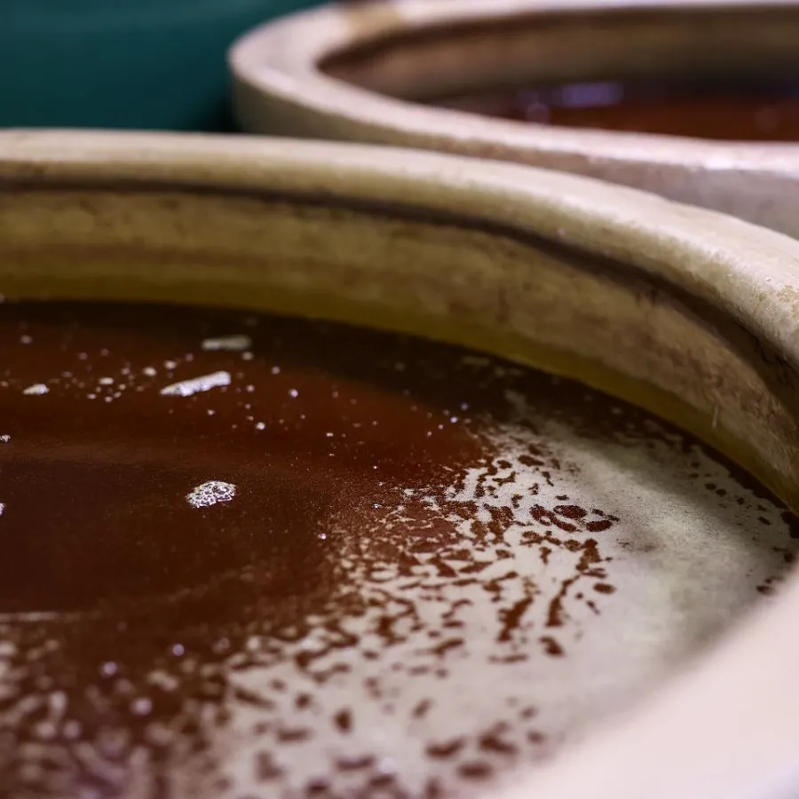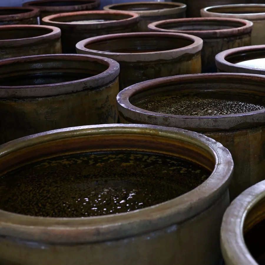 陶製のかめを使用し、陶器の特性や形状による遠赤外線効果や自然対流を活かした発酵・熟成をすることで、素材本来の力を引きだし、まろやかな風味やコクを醸成しています。