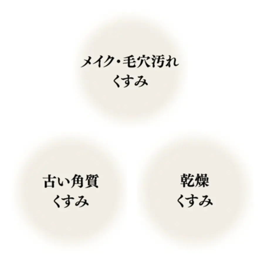 メイクや毛穴汚れ・古い角質・乾燥による「3大くすみ」にアプローチし、うるおいに満ちた透明感のある肌へ洗いあげます。