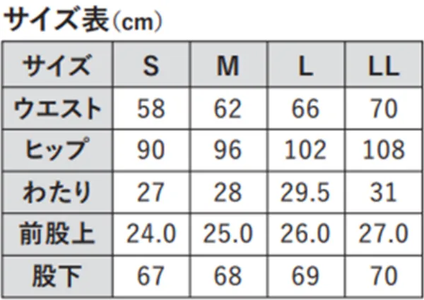 サイズ(別表参照):S、M、L、LL